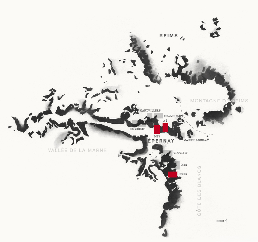 Champagne Jacquesson skapar sina mästerliga mousserande viner från 36 hektar vingårdar klassificerade som Grand Cru och Premier Cru – dessa 36 hektar utgörs av 28 hektar egna vingårdar och 8 hektar från tre långtidskontrakterade odlare som arbetat sida vid sida med Jacquesson under många år samt några mindre småodlare. Dessa exceptionella vingårdsparceller är fördelade mellan två av Champagnes mest emblematiska områden: Côte des Blancs (Avize och Oiry) och Grande Vallée de la Marne (Aÿ, Dizy och Hautvillers).