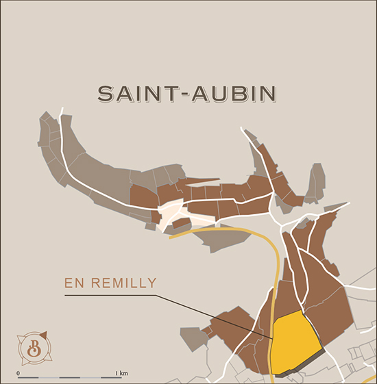 nr 5216101Vingårdsläget ’En Remilly’ ligger i de sluttning som gränsar till de största namnen i den gyllene triangeln (Chassagne-Montrachet, Puligny-Montrachet och Saint Aubin). Detta läge ligger enbart några meter från Grand Cru-läget Montrachet och erkänns som det bästa premier cru-läget i Saint-Aubin.
